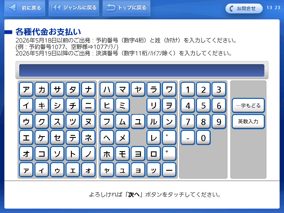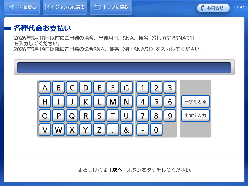 E.g.: Reservation Number 1077, Mr.Solano ⇒ 1077Solano - For flights departing on or after May 19, 2026: Settlement number (11 digits/excluding hypens)