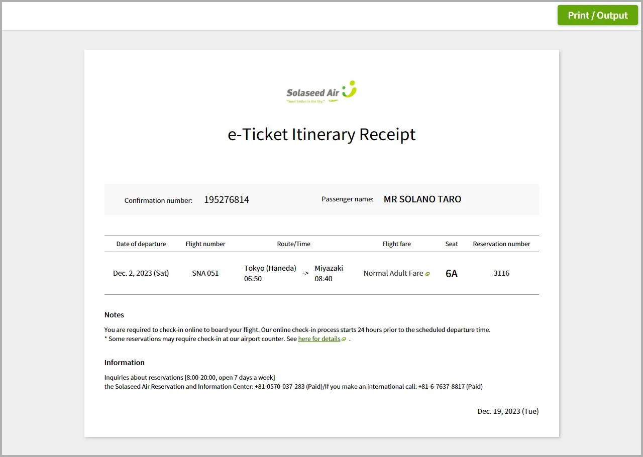 If you made a reservation on the Solaseed Air website or through Reservation and Information Center, e-Ticket Itinerary Receipt can be obtained on the Solaseed Air website.