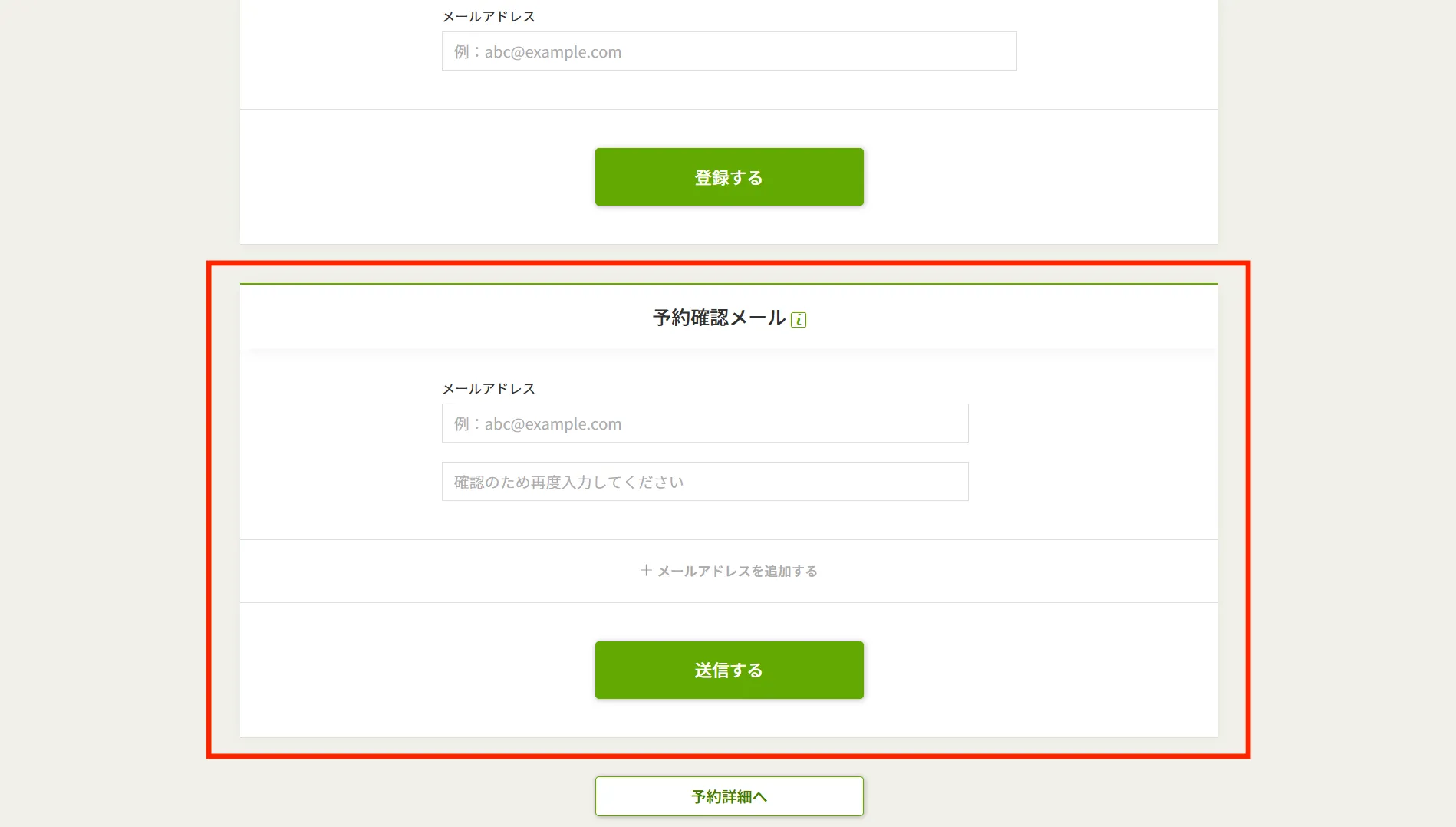 「メール送信サービスの設定」画面にて「予約確認メール」枠内の「メールアドレス」欄に入力のうえ「送信する」ボタンを押してください。