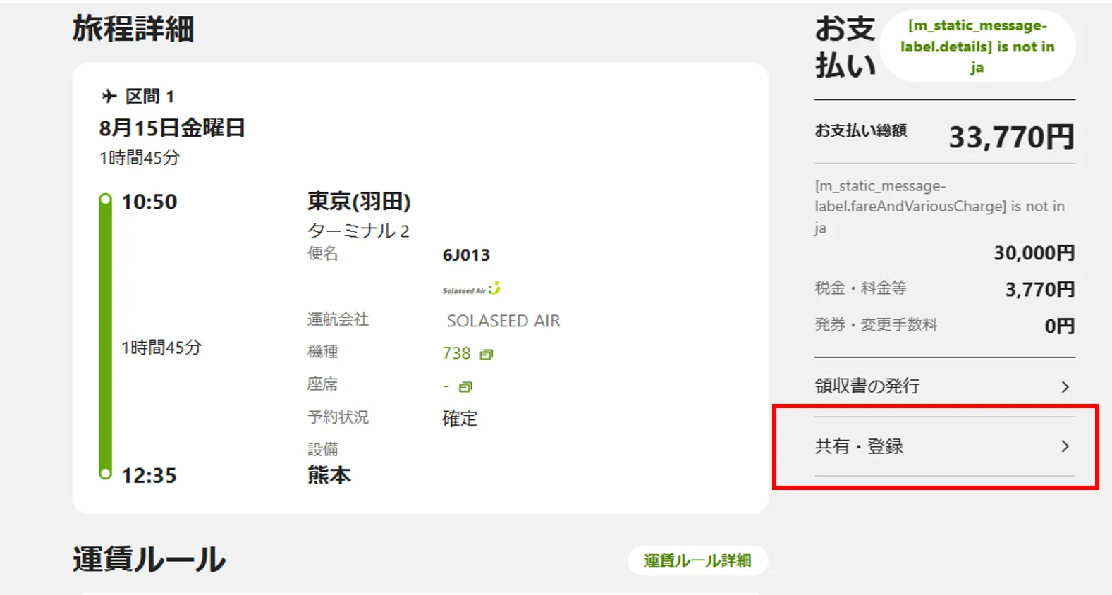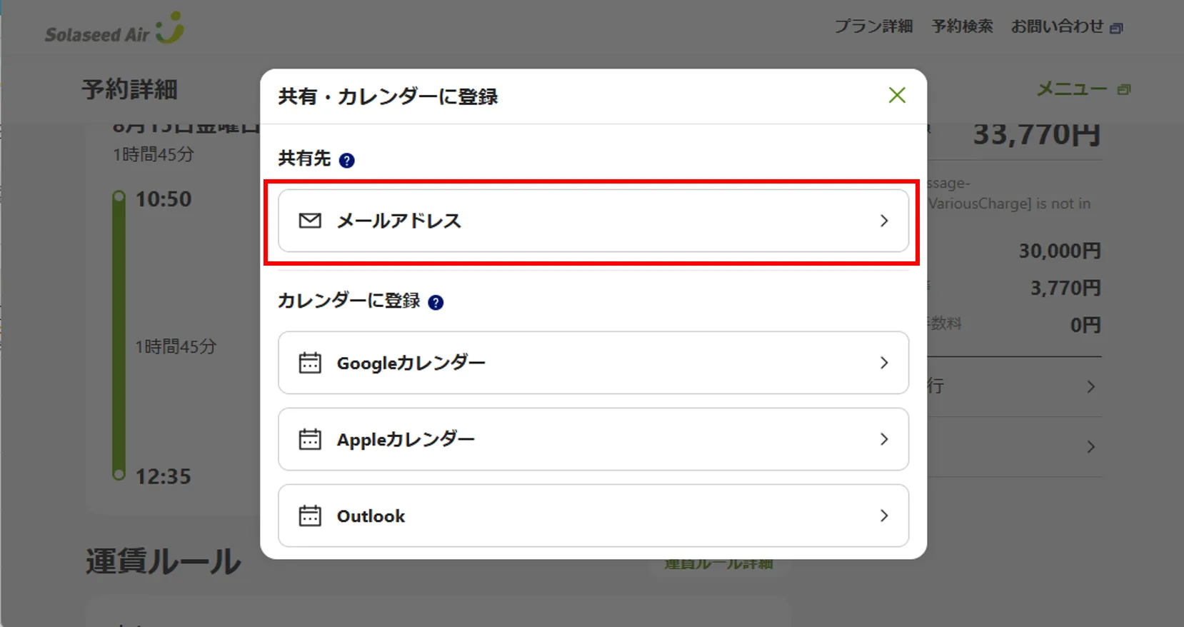 予約完了時/予約確認時に表示される「予約詳細」画面より「共有・登録」を選択してください。