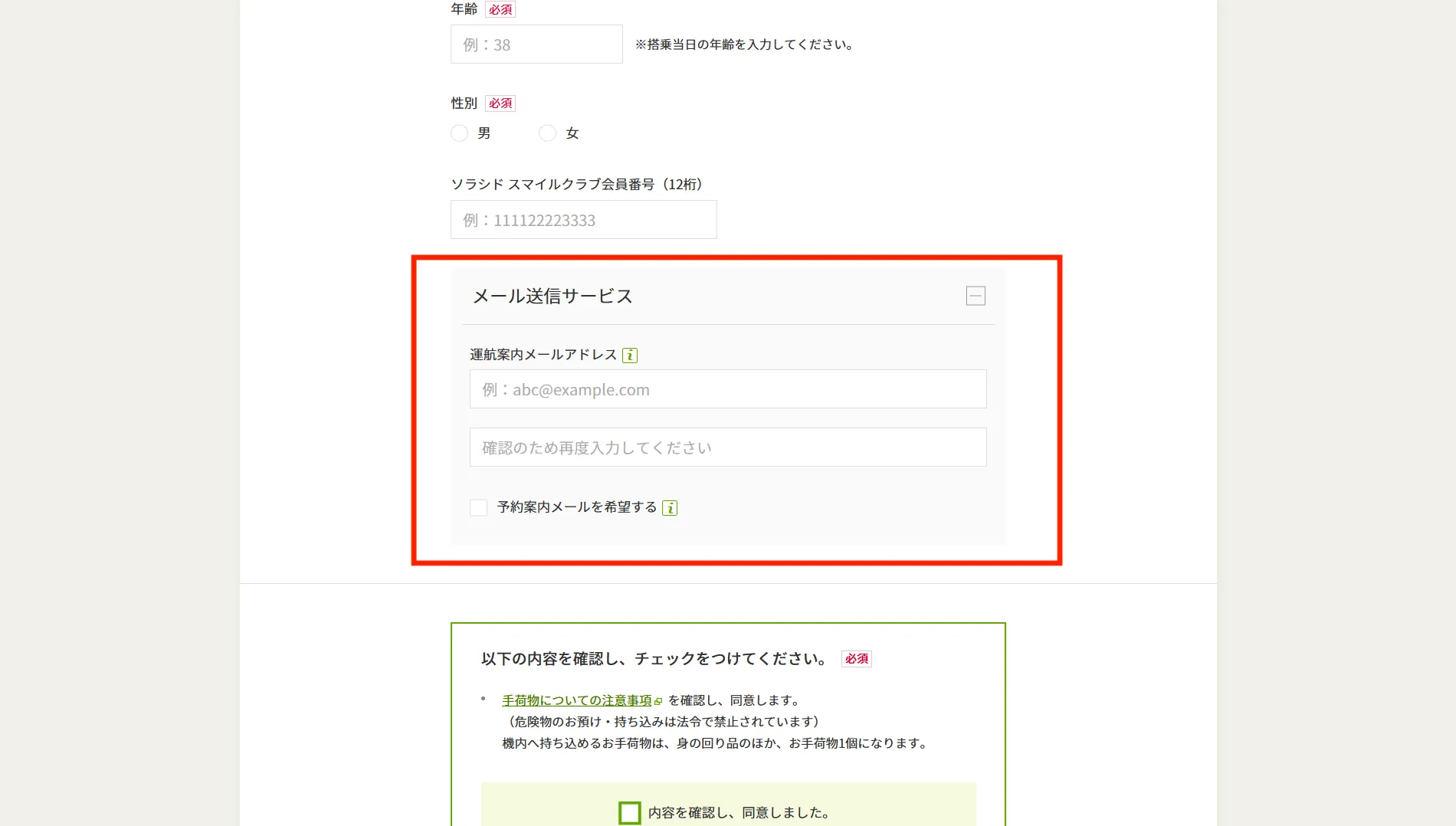複数名で予約されている場合、運航案内メールをご希望の方は「搭乗者2」以降の入力項目「メール送信サービス」の部分に「メールアドレス」をご入力ください。