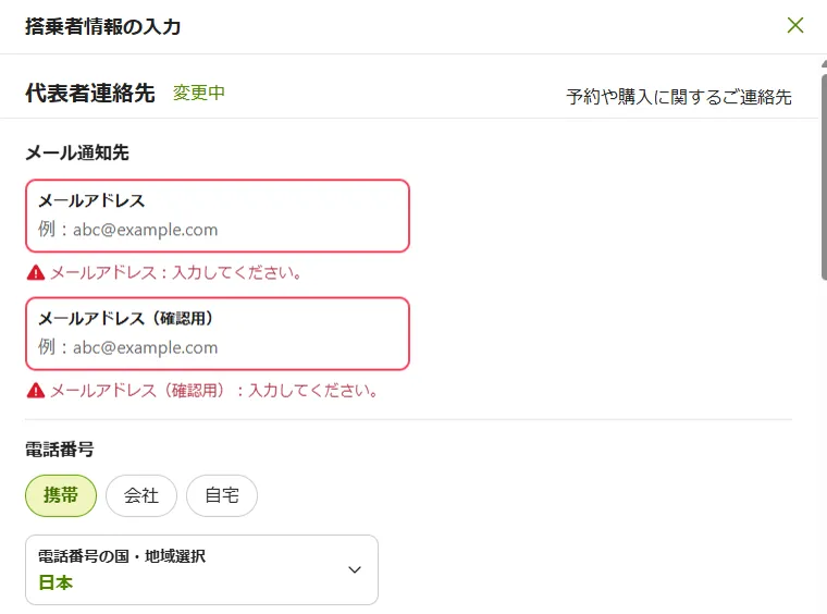 予約時に表示される「搭乗者情報入力」画面にて、必要事項をご入力ください。