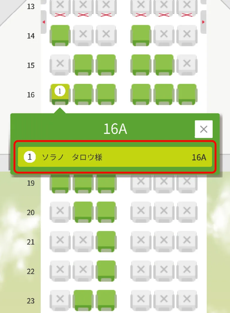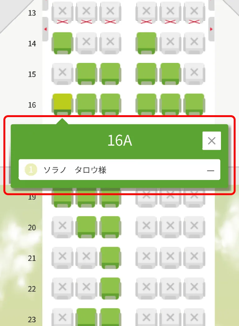 ご希望のお座席を選択するとお客様氏名が表示されます。
