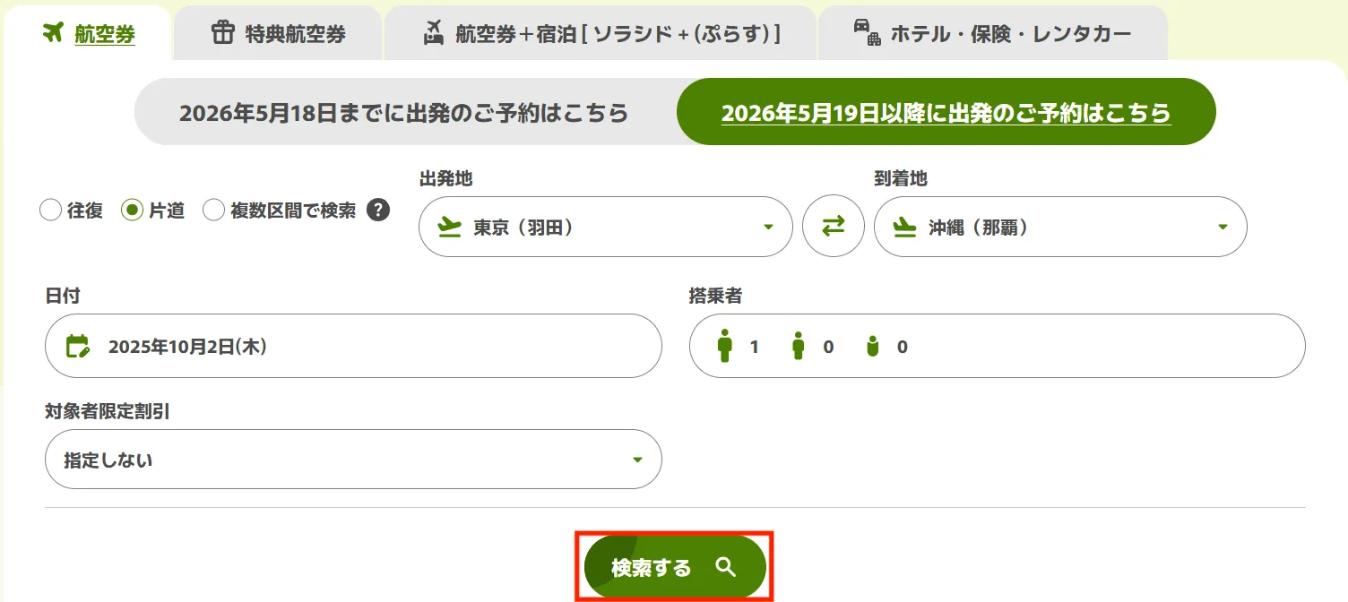 ソラシドエア ホームページでご希望の出発地・到着地・搭乗日を選択のうえ検索してください。