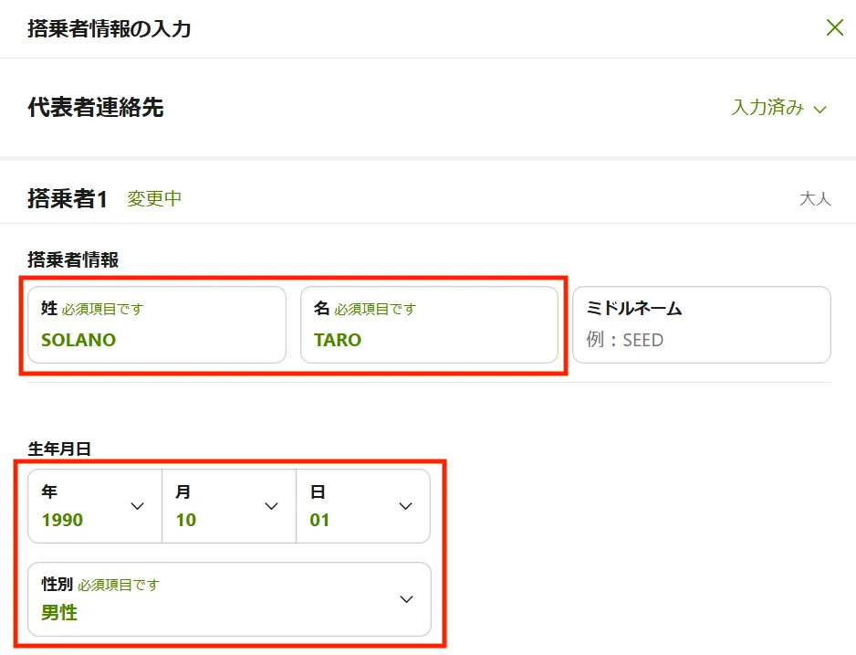 ご希望の便を選択いただき、「搭乗者情報の入力」画面でご搭乗者情報を入力してください。