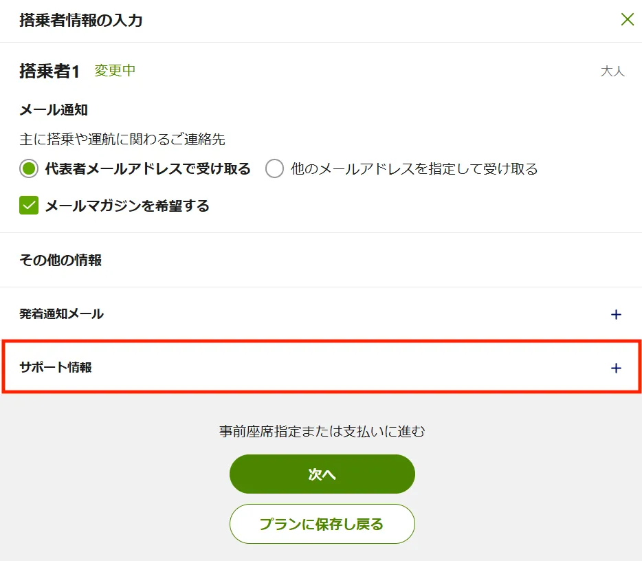 「搭乗者情報の入力」画面下部の「サポート情報」横の「+」ボタンを押してください。