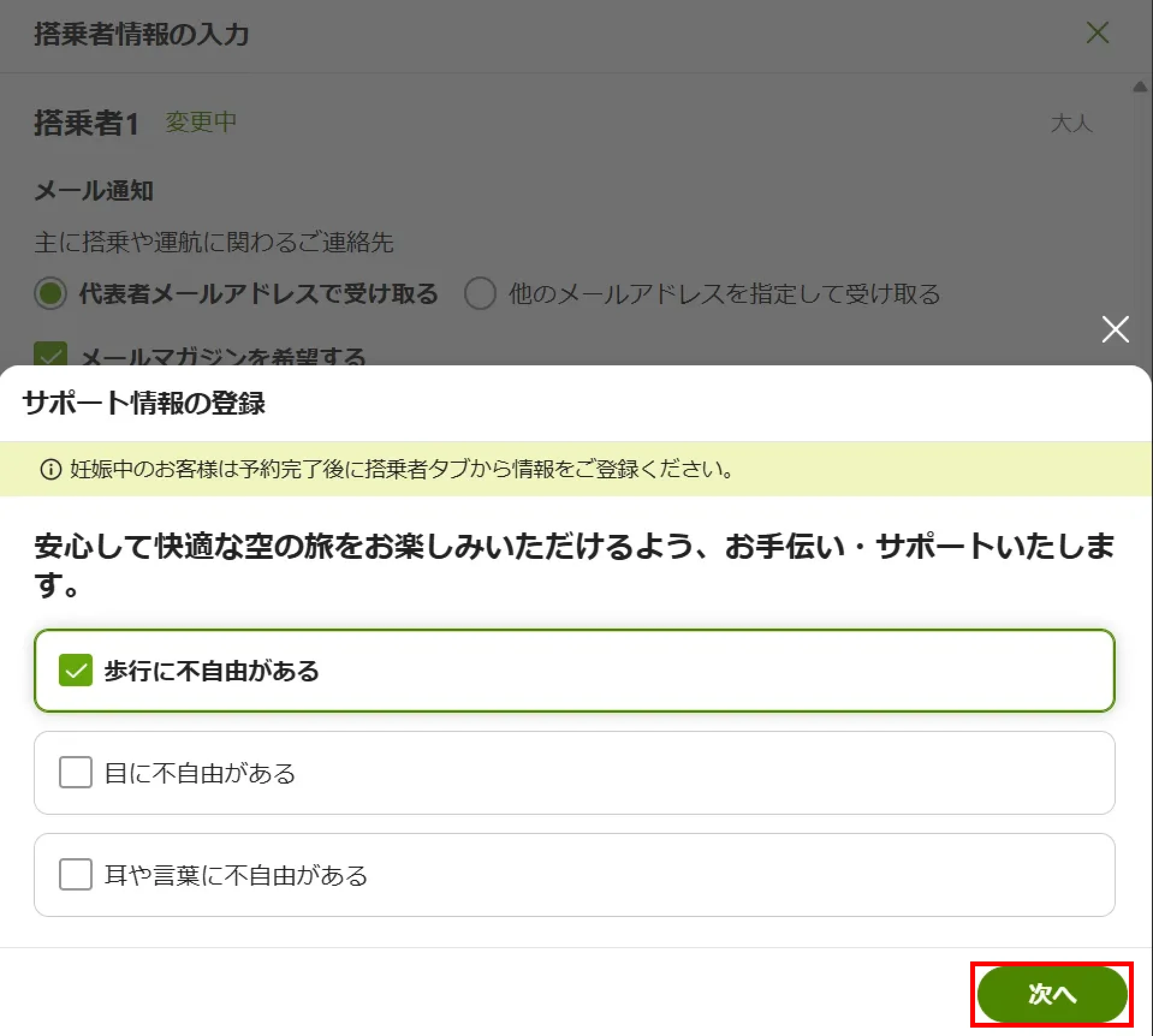 歩行に不自由のあるお客様、目に不自由があるお客様、耳や言葉に不自由のあるお客様はこちらからサポート情報の登録が可能です。