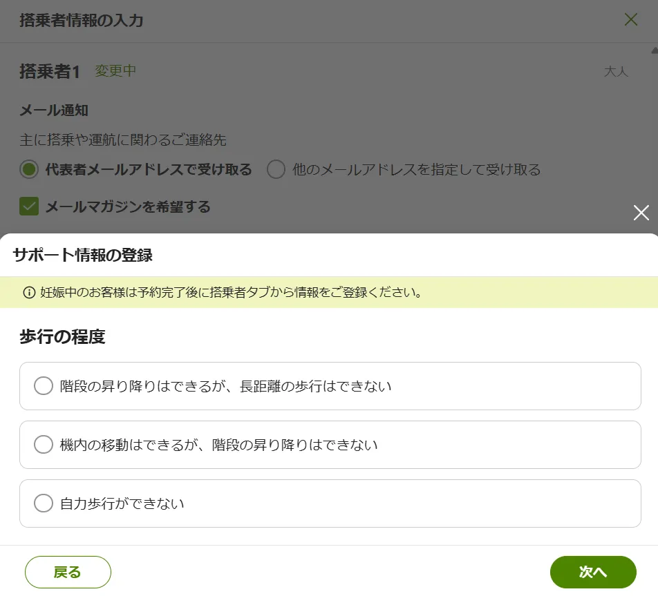 「歩行に不自由がある」を選択いただいたお客様は、歩行の程度、車いすの預け入れの有無、車いすの折りたたみの可否、車いすの種類(手動・電動)、バッテリータイプの登録が必要です。