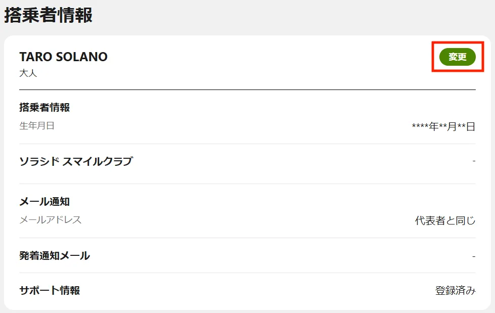 ご予約後にサポート情報の変更・登録をおこなう場合は、「予約詳細」画面の「搭乗者情報」入力画面で「変更」ボタンを押していただき、