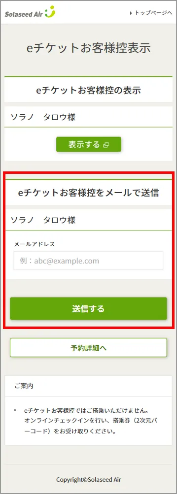 ソラシドエア ホームページ上でeチケットお客様控を取得する場合はこちら