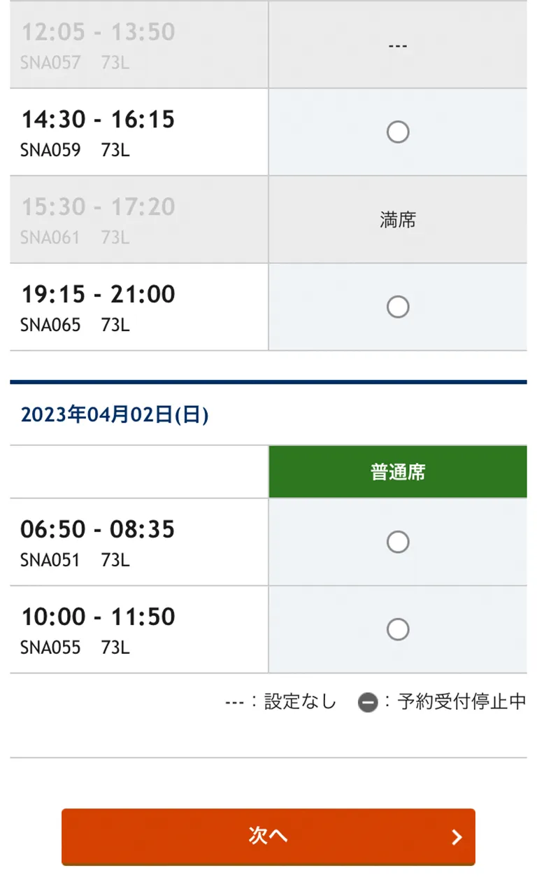 ご搭乗を希望する便を選択し、「次へ」をクリック(タップ)してください。