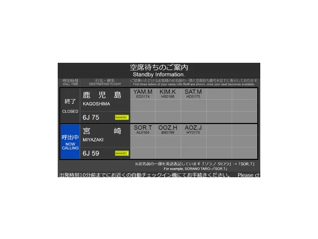 座席が用意できたお客様のお名前の一部と空席待ち番号を、搭乗口付近に設置しているデジタルサイネージに表示します。